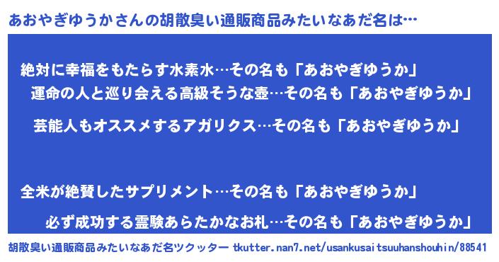 | 男性向けラノベタイトル風あだ名 | 『うちのあおやぎゆうかが世界を掌握している!』 |