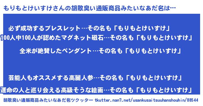 | 男性向けラノベタイトル風あだ名 | 『もりもとけいすけ~年齢イコール彼女いない歴の魔法使い~』 |