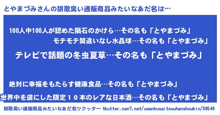 | ヘコむあだ名 | 『とやっふぃ~』『とやまづみ(震え声)』 |