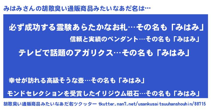 | 男性向けラノベタイトル風あだ名 | 『Re:みはみから始める異世界生活』 |
