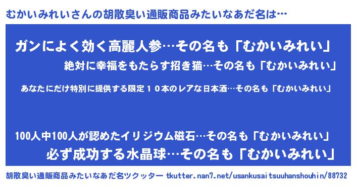 | 意味不明あだ名 | 『住所不定無職むかいみれい(53歳)』 |
