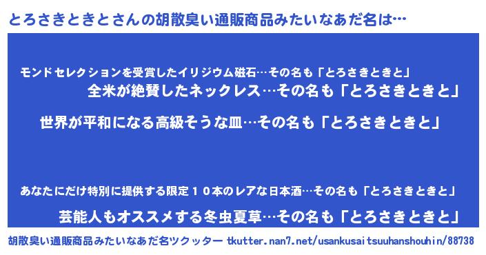 | 男性向けラノベタイトル風あだ名 | 『転生したらとろさきときとだった件』 |