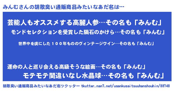 | 男性向けラノベタイトル風あだ名 | 『魔弾の王とみんむ』『みんむの憂鬱』 |