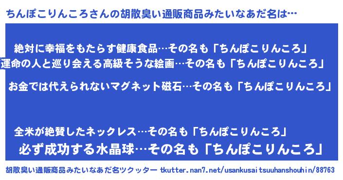 | ヘコむあだ名 | 『ちんぽこりんころ(笑)』『ちんにゅー』 |