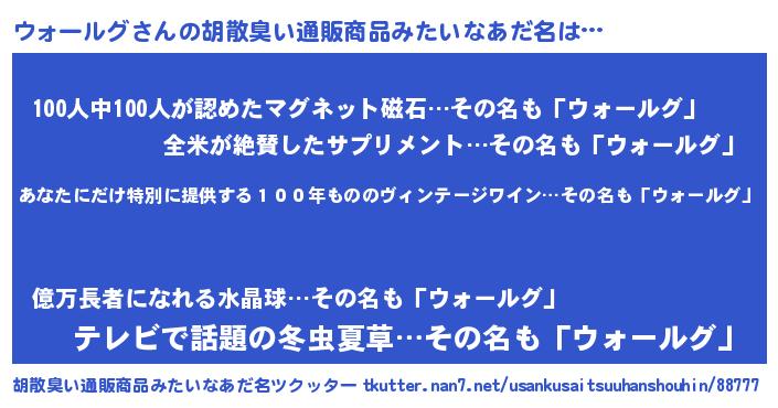 | 男性向けラノベタイトル風あだ名 | 『この素晴らしい世界にウォールグを!』 |
