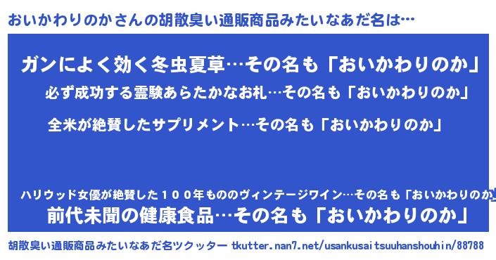 | 女子向けラノベタイトル風あだ名 | 『おいかわりのか様がみてる』 |