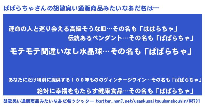 | 男性向けラノベタイトル風あだ名 | 『転生したらぱぱらちゃだった件』 |