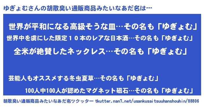 | 男性向けラノベタイトル風あだ名 | 『ゆぎょむの嫁は女の子じゃないと思った?』 |