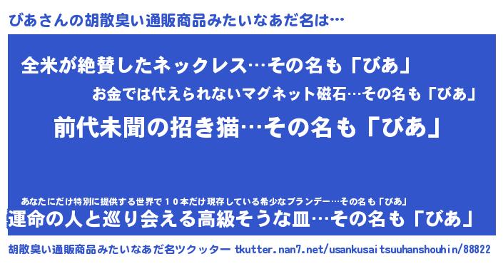 | ヘコむあだ名 | 『びあ(笑)』『びあっ子』『なまこ酢』 |