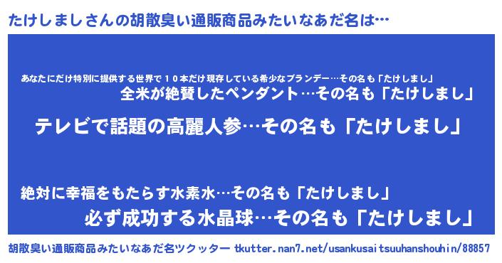 | 恥ずかしいあだ名 | 『タケシマシデラックス』『タケリンリン』 |