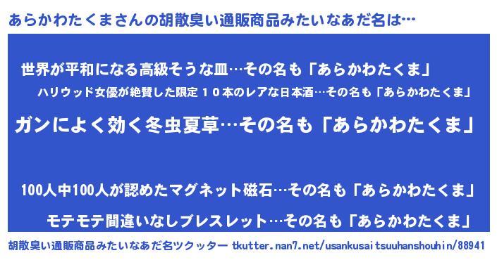 | 女子向けラノベタイトル風あだ名 | 『あらかわたくまなんてお断りですっ。』 |