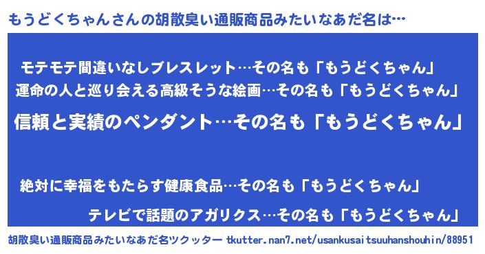 | 欧米人風あだ名 | 『ウサインもうどくちゃん』 |