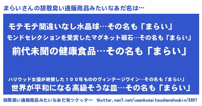 | ヘコむあだ名 | 『まらい(爆)』『まらにー』『豆乳』 |