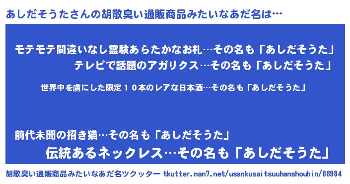 | ヘコむあだ名 | 『あしもー』『あしっちょ』『豆乳』 |