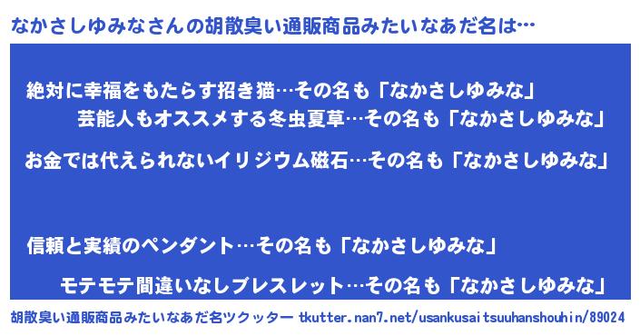 | 男性向けラノベタイトル風あだ名 | 『おまえをオタクにしてやるから、俺をなかさしゆみなにしてくれ! 』 |