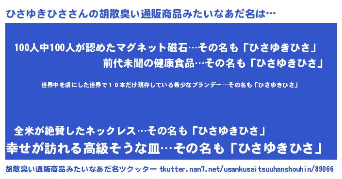 | 男性向けラノベタイトル風あだ名 | 『魔弾の王とひさゆきひさ』 |