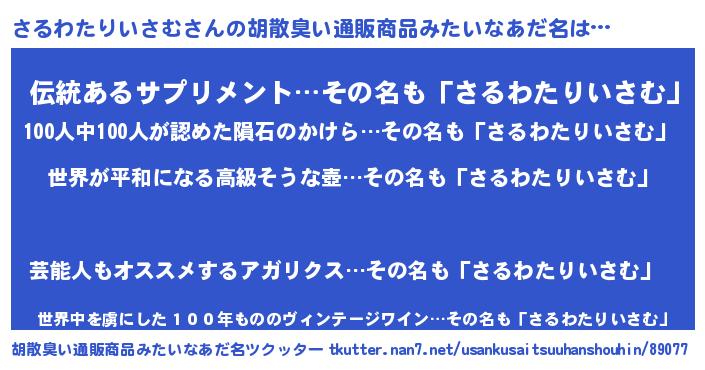 | 男性向けラノベタイトル風あだ名 | 『やはりさるわたりいさむの青春ラブコメはまちがっている 』 |