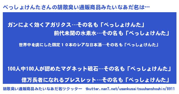 | 意味不明あだ名 | 『住所不定無職べっしょけんた(40歳)』 |