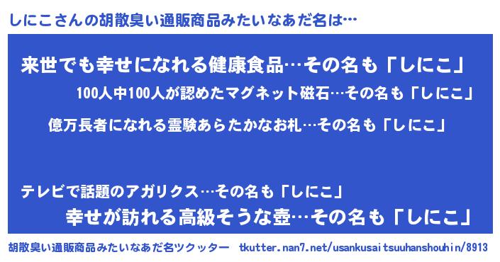 | 欧米人風あだ名 | 『マイケルしにこ』『ダルビッシュしにこ』 |