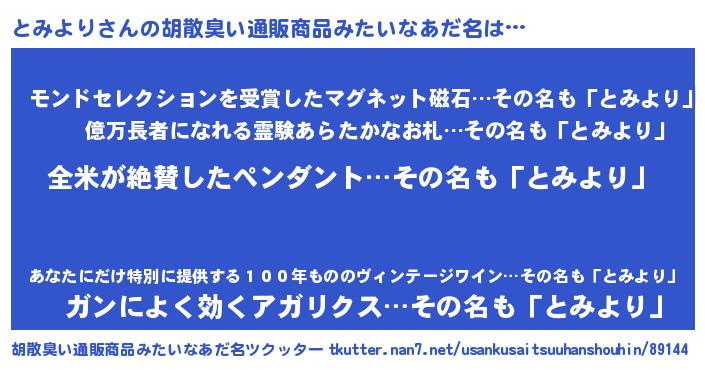 | 男性向けラノベタイトル風あだ名 | 『とみより~年齢イコール彼女いない歴の魔法使い~』 |