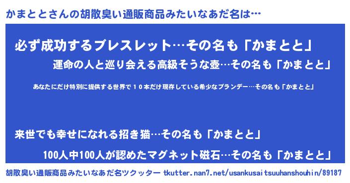 | 意味不明あだ名 | 『住所不定無職かまとと(95歳)』 |