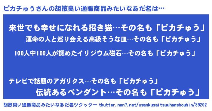 | 男性向けラノベタイトル風あだ名 | 『おまえをオタクにしてやるから、俺をピカチゅうにしてくれ! 』 |