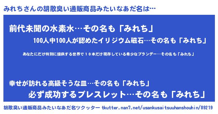 | 意味不明あだ名 | 『住所不定無職みれち(71歳)』 |
