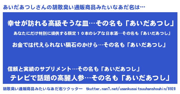 | 男性向けラノベタイトル風あだ名 | 『転生したらあいだあつしだった件』 |