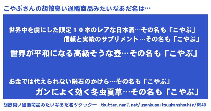 | 意味不明あだ名 | 『こやぶフォーエバー』『自称こやぶ』 |