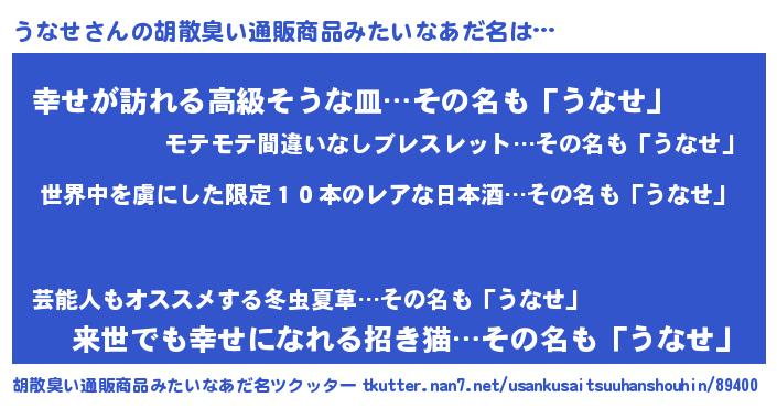 | 男性向けラノベタイトル風あだ名 | 『この素晴らしい世界にうなせを!』 |