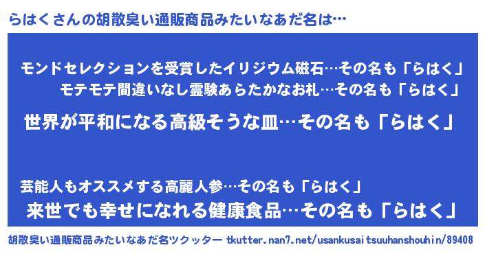 | ヘコむあだ名 | 『豆乳』『らはく(苦笑)』『らはお』 |