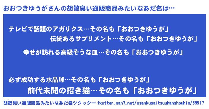| 男性向けラノベタイトル風あだ名 | 『やはりおおつきゆうがの青春ラブコメはまちがっている 』 |