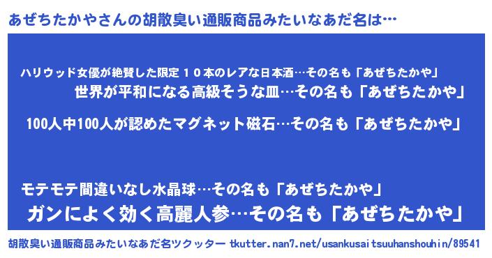 | 男性向けラノベタイトル風あだ名 | 『おまえをオタクにしてやるから、俺をあぜちたかやにしてくれ! 』 |