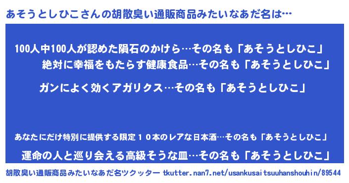 | 男性向けラノベタイトル風あだ名 | 『アソウトシヒコスレイヤー』 |