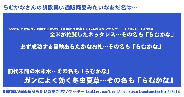 | 男性向けラノベタイトル風あだ名 | 『らむかなの憂鬱』『ラムカナスレイヤー』 |