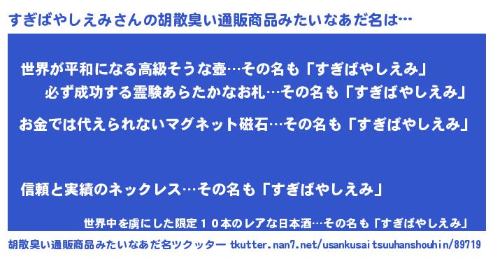| 男性向けラノベタイトル風あだ名 | 『おまえをオタクにしてやるから、俺をすぎばやしえみにしてくれ! 』 |