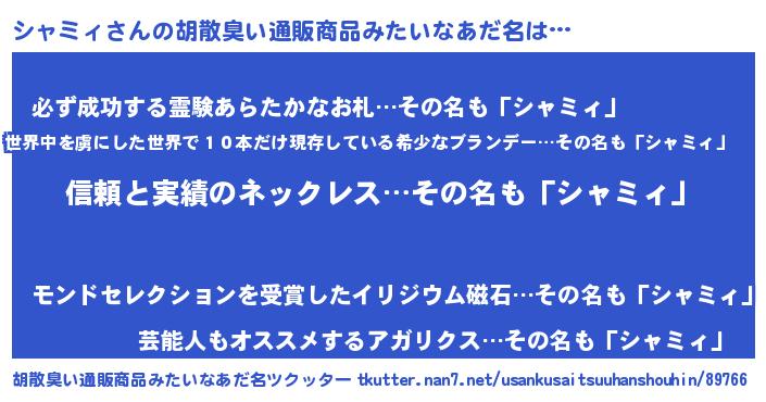 | 女子向けラノベタイトル風あだ名 | 『シャミィは平凡を望む』『闇のシャミィ』 |