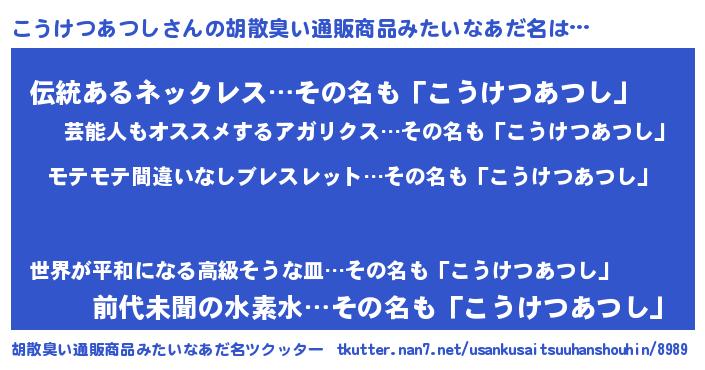 | 男性向けラノベタイトル風あだ名 | 『こうけつあつしの憂鬱』 |