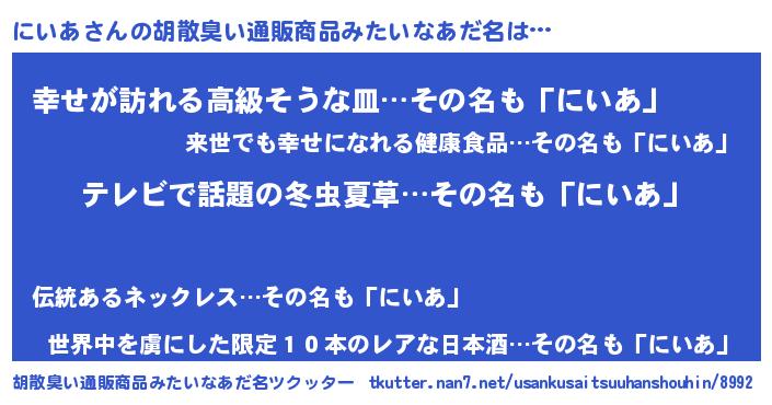 | ヒーロー風カッコイイあだ名 | 『サイバー戦士ニイア』『仮面ニイダー』 |