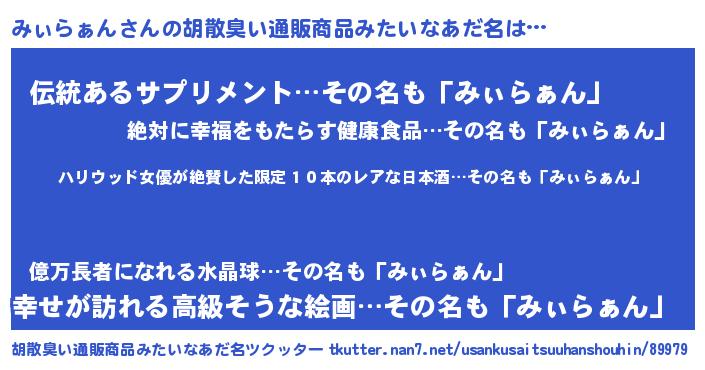 | 男性向けラノベタイトル風あだ名 | 『ミィラァンスレイヤー』 |