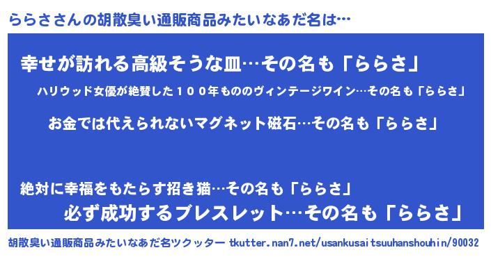 | ヒーロー風カッコイイあだ名 | 『慈愛の使者ららさ』『スーパーララサ』 |
