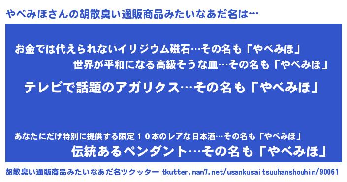 | 男性向けラノベタイトル風あだ名 | 『Re:やべみほから始める異世界生活』 |