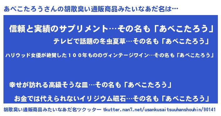 | 意味不明あだ名 | 『住所不定無職あべこたろう(2歳)』 |