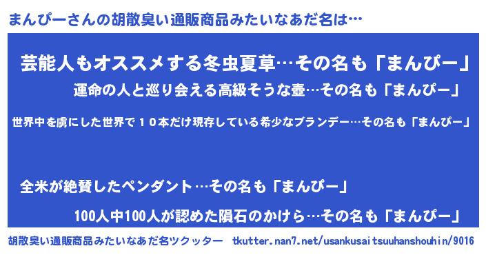 | 男性向けラノベタイトル風あだ名 | 『転生したらまんぴーだった件』 |