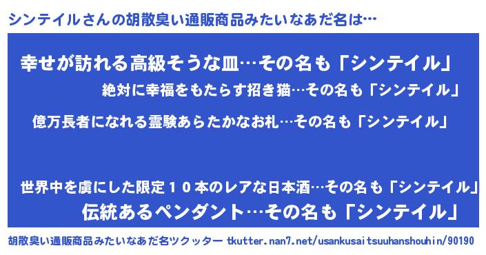 | 男性向けラノベタイトル風あだ名 | 『シンテイル~年齢イコール彼女いない歴の魔法使い~』 |