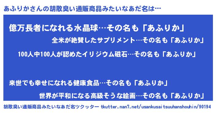 | ヒーロー風カッコイイあだ名 | 『正義の使者あふりか』『魔戒騎士アフ』 |