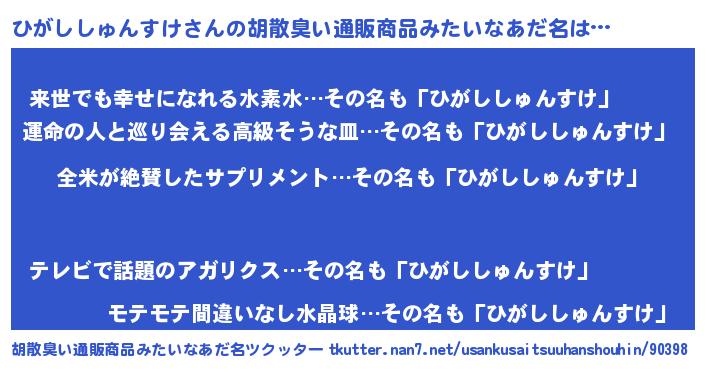 | 男性向けラノベタイトル風あだ名 | 『ひがししゅんすけの嫁は女の子じゃないと思った?』 |