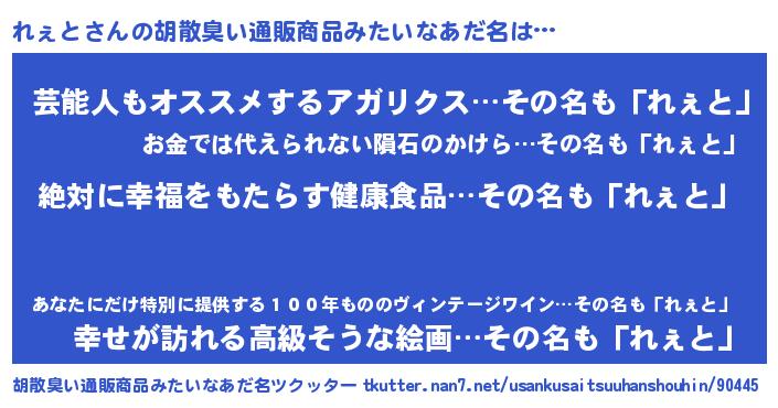 | 男性向けラノベタイトル風あだ名 | 『れぇとという概念が存在しない退屈な世界 』 |