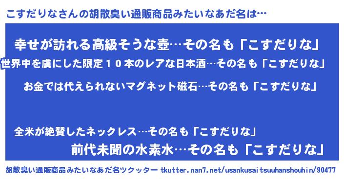 | ヘコむあだ名 | 『なまこ酢』『こすだりな(爆)』 |