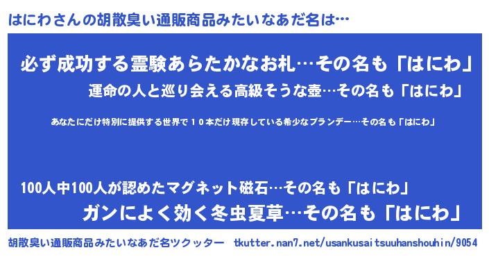 | 意味不明あだ名 | 『住所不定無職はにわ(95歳)』『自称はにわ』 |